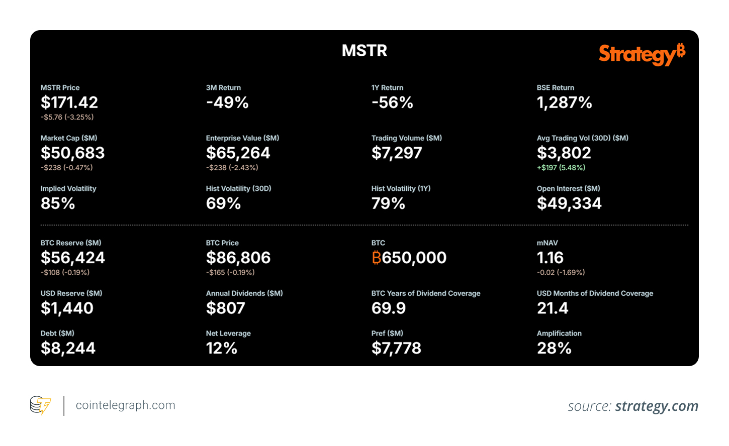 • Market-cap-to-net-asset-value (nNAV): The ratio between Strategy’s total market value and the market value of its Bitcoin holdings. If mNAV is above 1, the stock trades at a premium to its BTC.