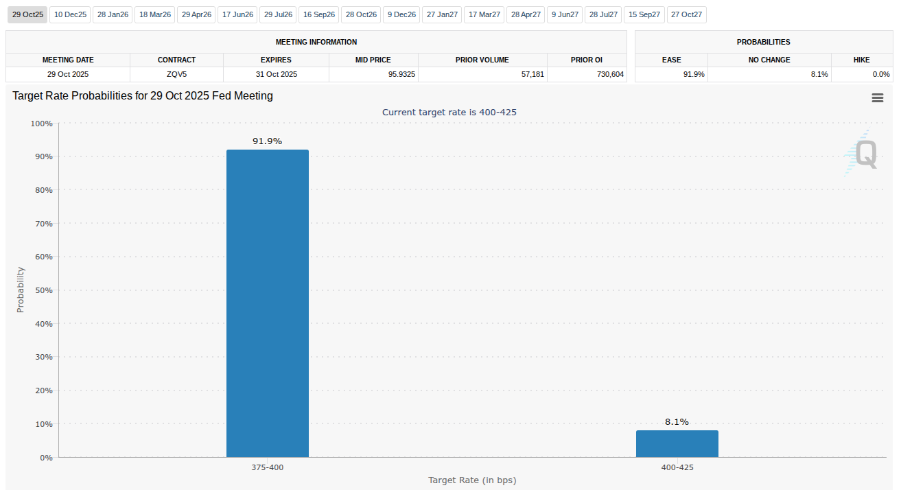 The latest data from CME Group’s FedWatch Tool shows that expectations for the Fed’s Oct. 29 meeting firmly point toward another 0.25% reduction.