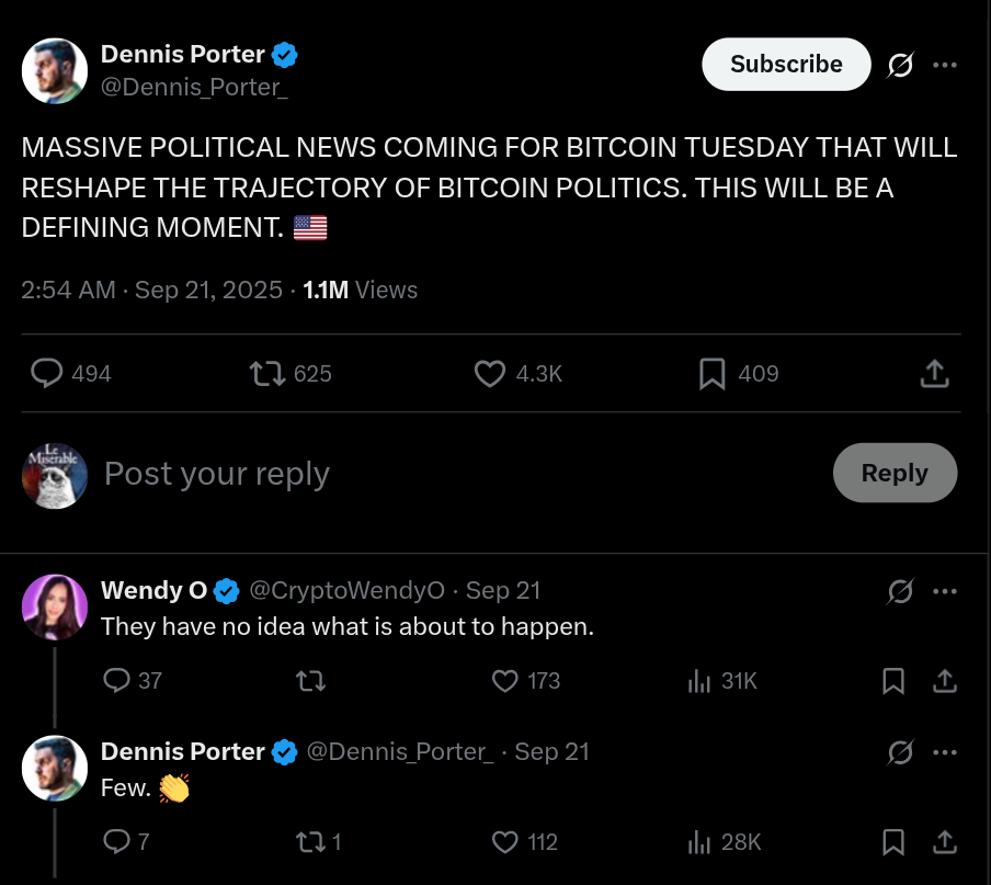 The exact nature of the announcement is unknown, but in an X post on Sunday, Dennis Porter, CEO and co-founder of digital asset policy lobby Satoshi Fund, did not mince his words.