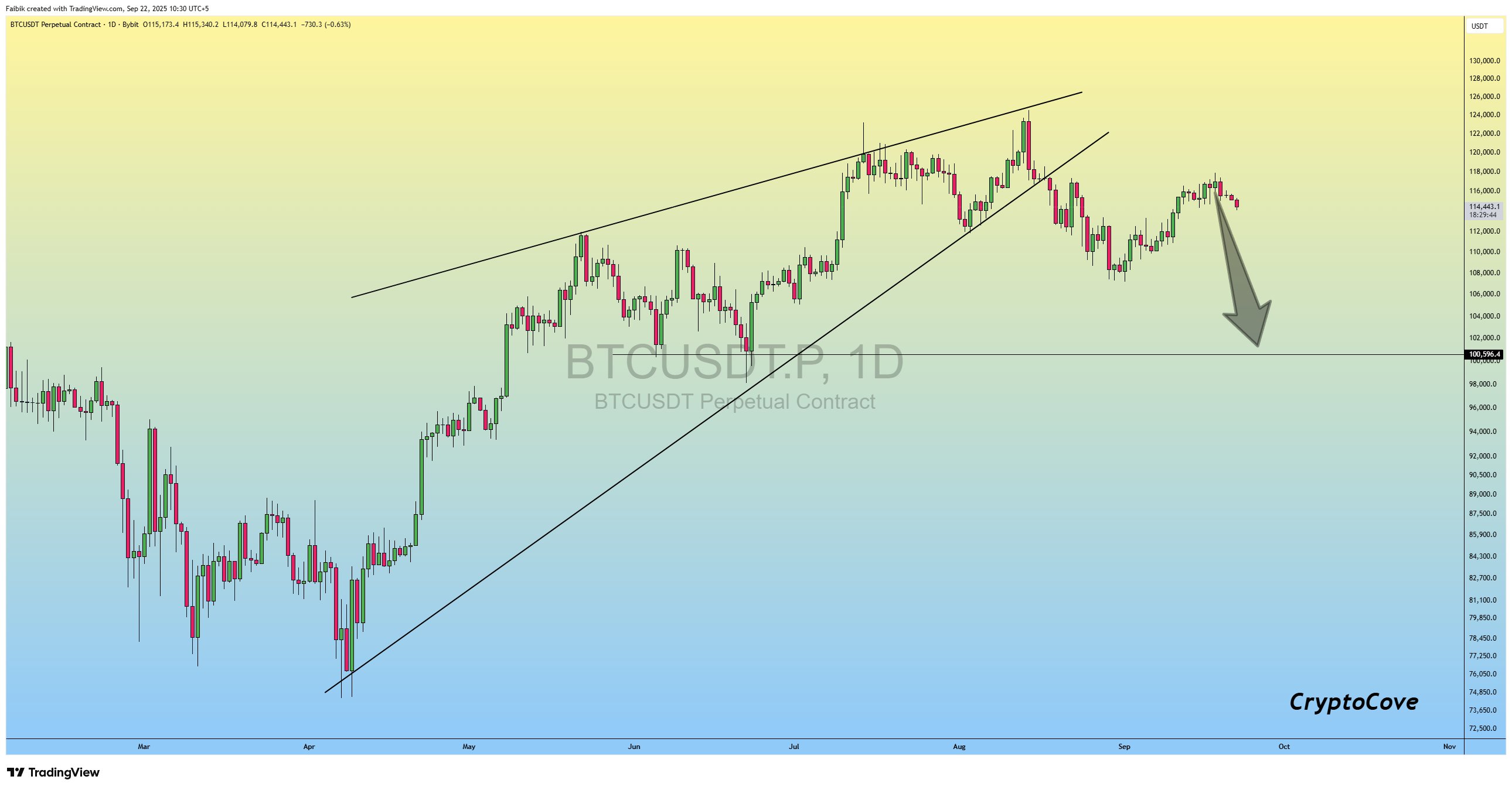 An accompanying chart showed a breakdown of a rising wedge structure on the BTC/USD daily chart.