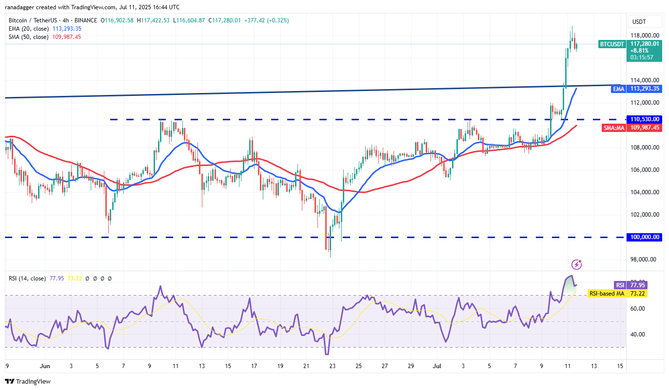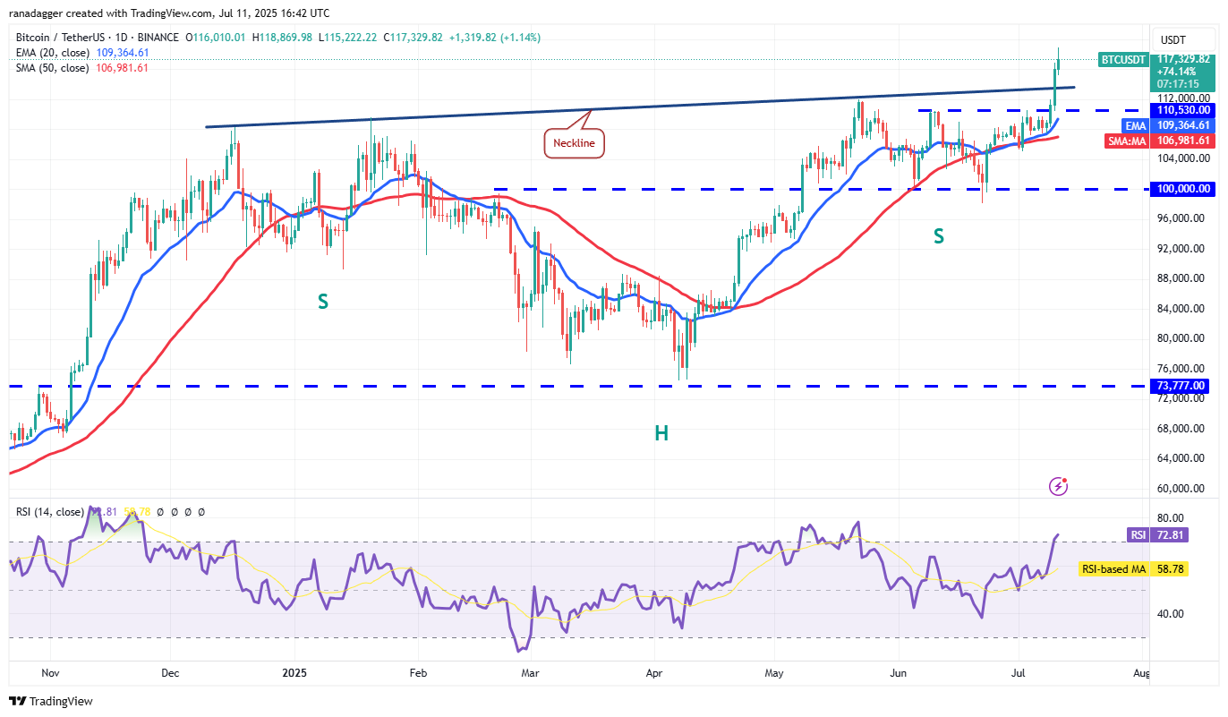 The price turned up sharply from $110,530 and broke above the neckline. The up move has pushed the relative strength index (RSI) into the overbought territory on the 4-hour chart. That increases the possibility of a short-term correction or consolidation. If the price maintains above the neckline, the uptrend could reach $123,000.