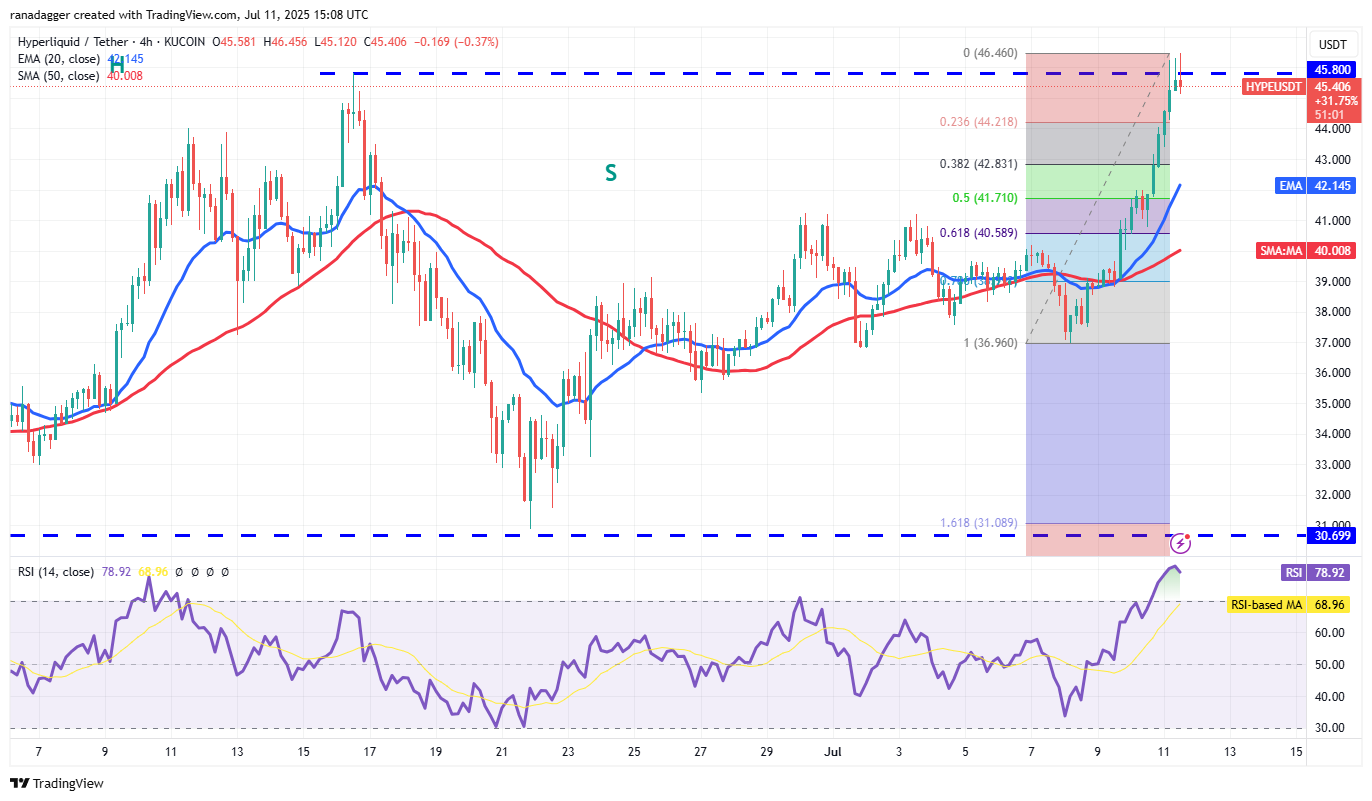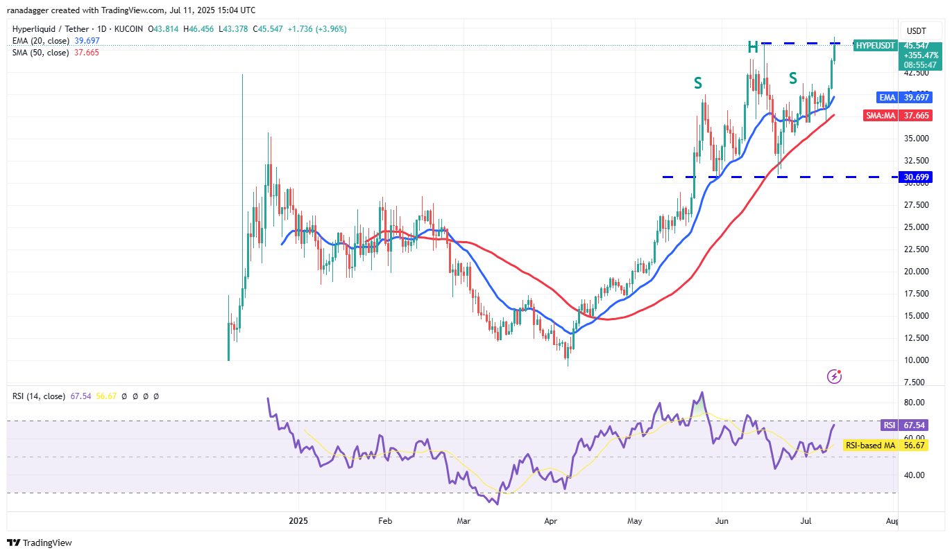 Hyperliquid (HYPE) rebounded off the 50-day SMA ($37.66) on Tuesday and picked up momentum after breaking above the 20-day EMA ($39.69).
