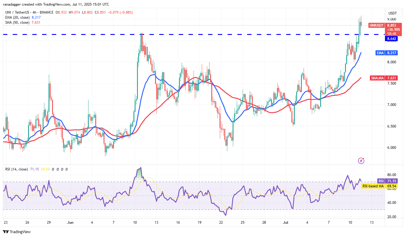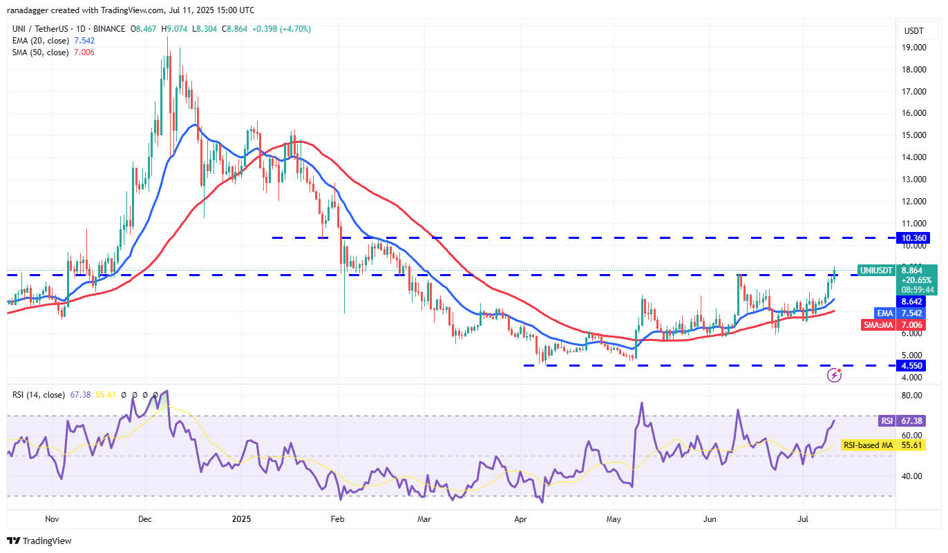 Both moving averages are sloping up, and the RSI is in the positive zone, indicating that buyers have the edge. There is resistance at $8.64, but a close above it opens the doors for a rally to $10.36. Sellers will try to halt the rally at $10.36, but if buyers do not allow the price to dip below $8.64 on the way down, the UNI/USDT pair could soar to $13.