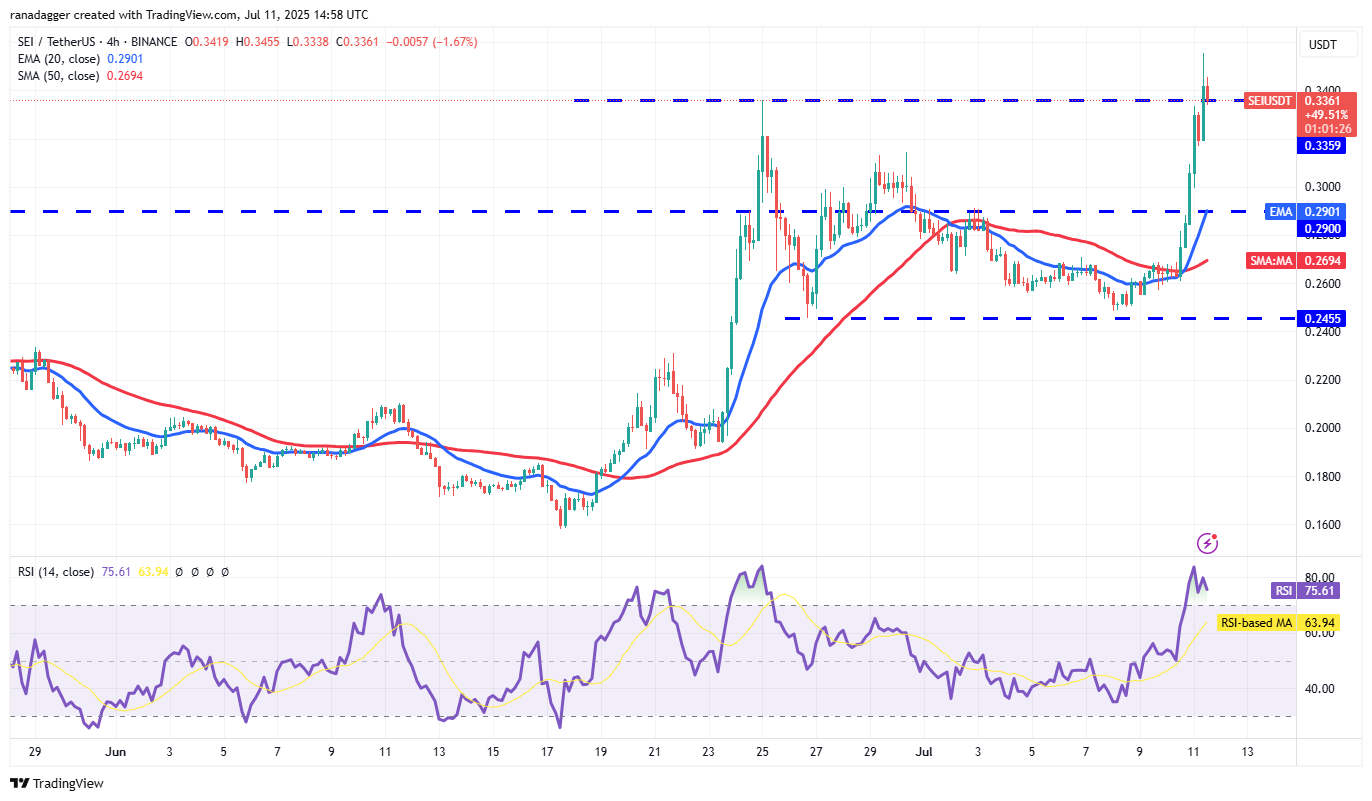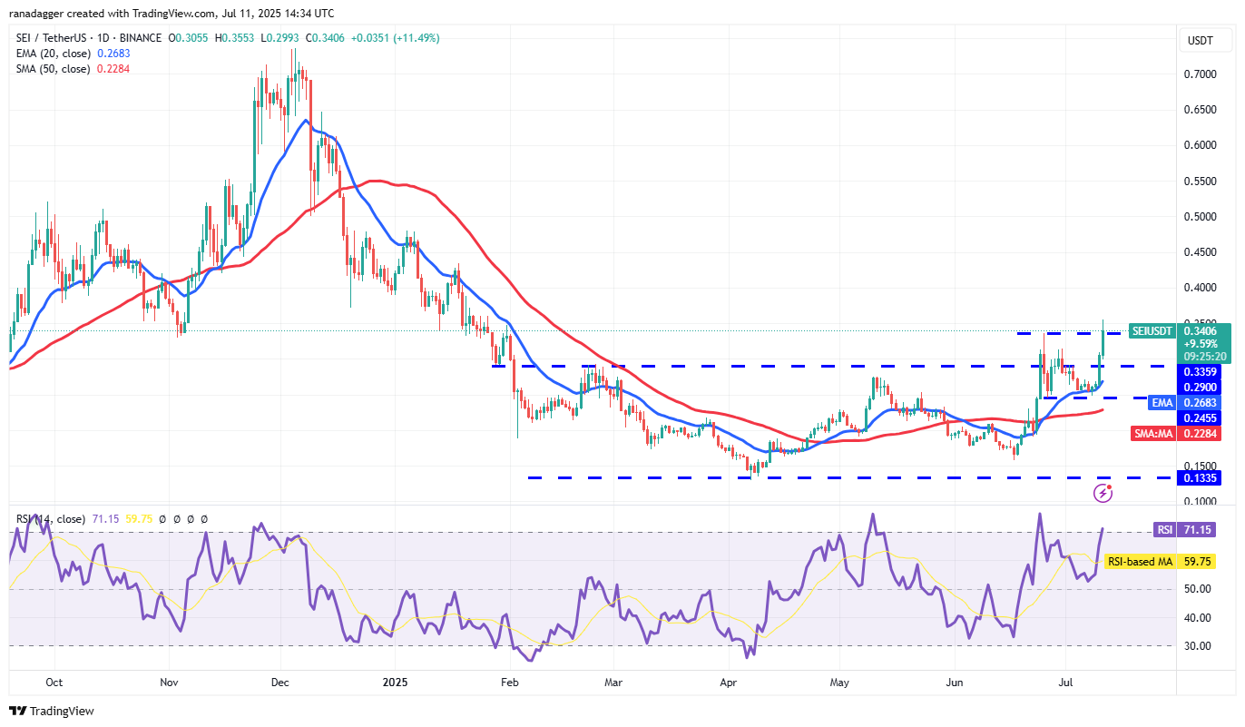 Sei (SEI) turned up sharply from the 20-day EMA ($0.26) on Thursday and has reached the overhead resistance of $0.34.