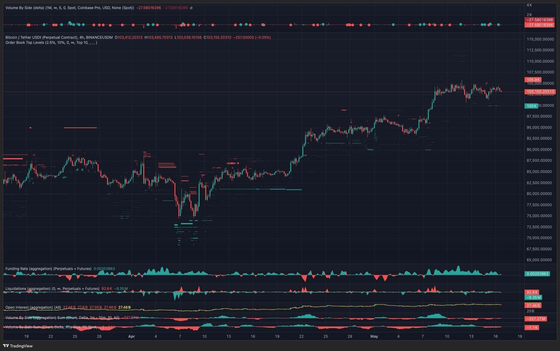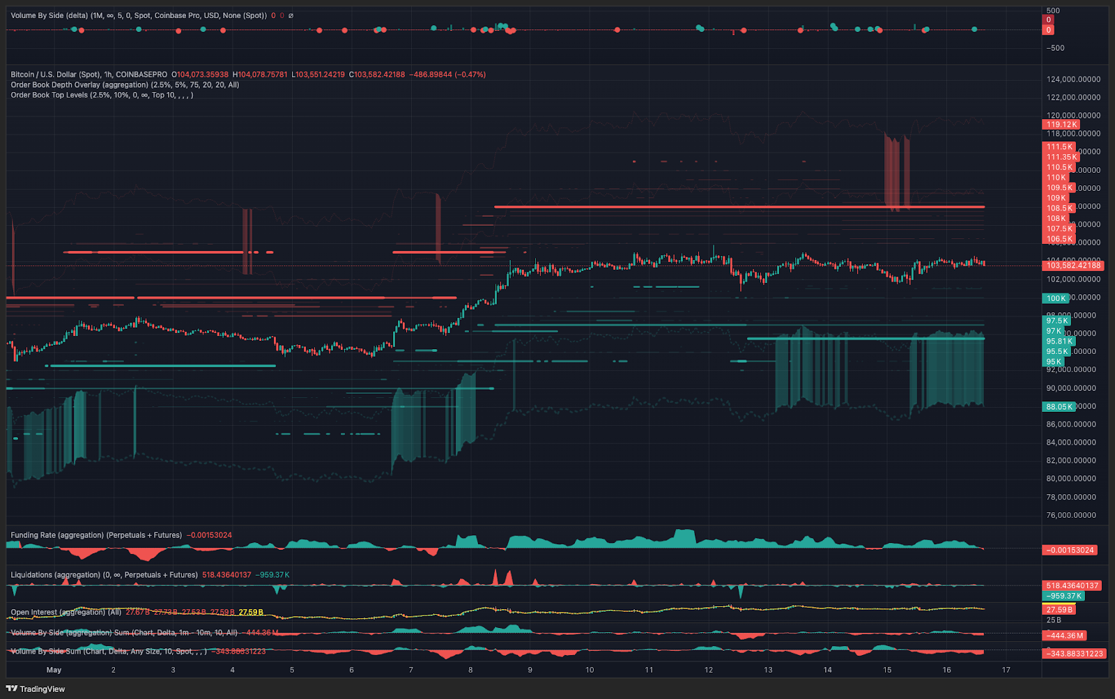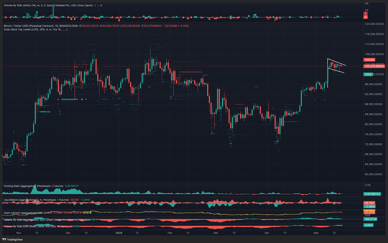 While the range-bound trading portion of the flag is said to represent indecision from buyers and sellers, in this scenario, the absence of buy volume is the primary culprit. As shown in the TRDR.io chart below, Bitcoin’s explosive move to $105,900 from $74,400 was accompanied by large liquidations in the margin markets and robust spot volumes, which aligned with several days of billion-dollar spot BTC ETF inflows.