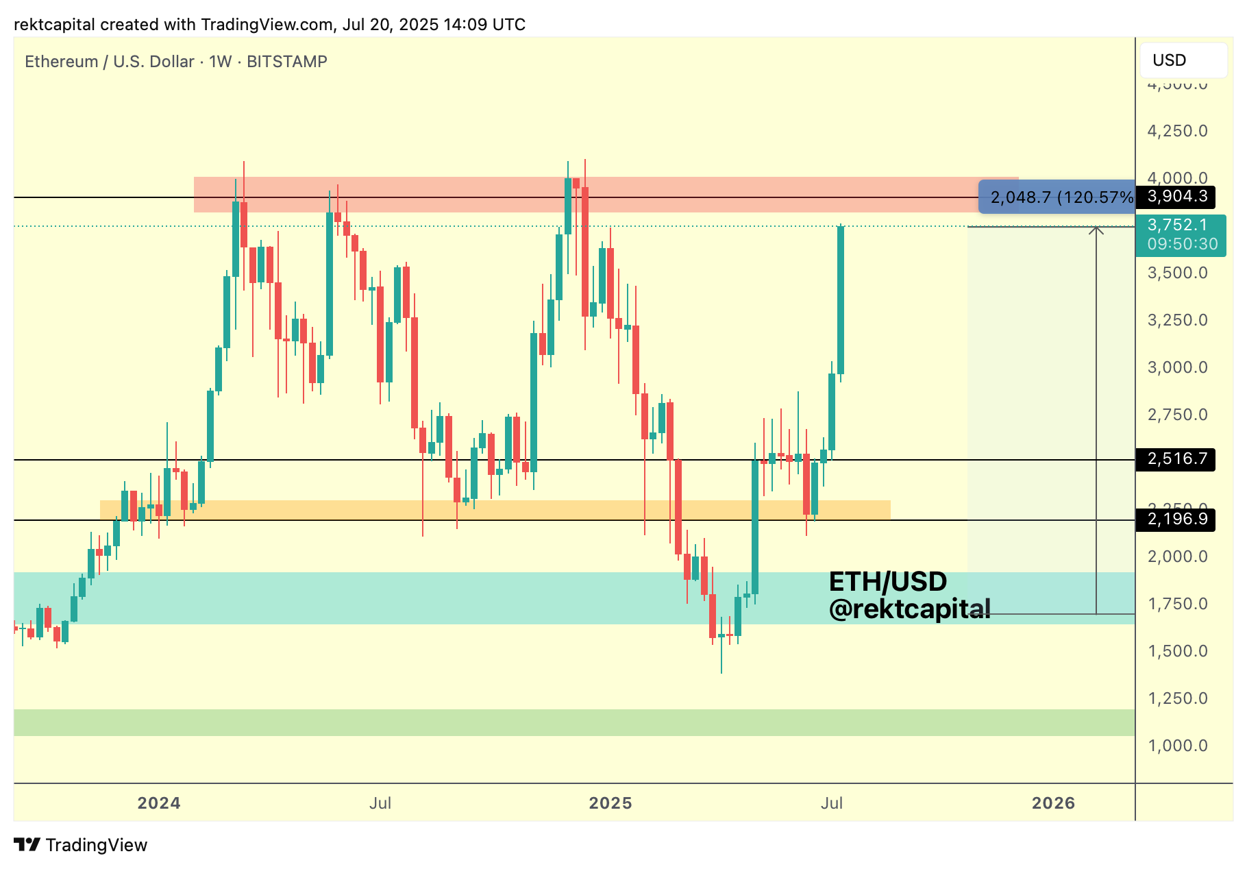 “Ethereum has long ago resynchronised with its $2200-$3900 Macro Range,” summarized in part of an X post which included a chart stretching back to late 2023.