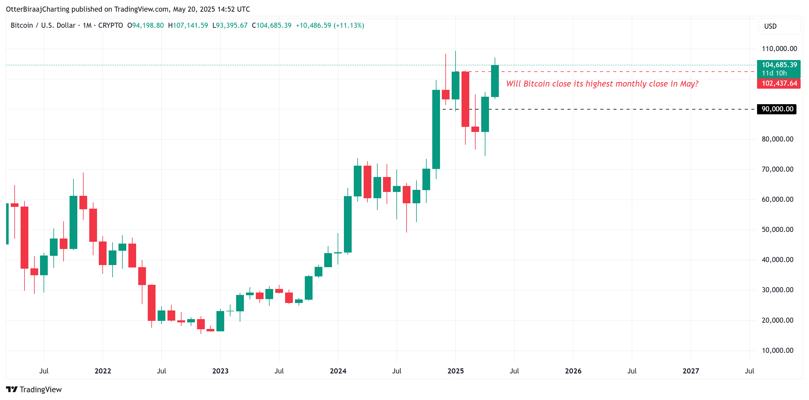 Bitcoin (BTC) is 11 days from potentially setting its highest monthly candle close in history. After achieving a record weekly close of $106,407 on May 18, BTC could secure a new monthly high by closing above $102,400 this month.