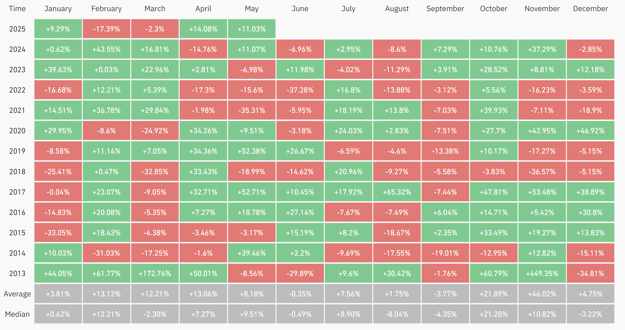A monthly close near $110,000 would mark a 15% to 17% gain for Bitcoin in May, its strongest May performance since 2019. This would significantly surpass the historical average monthly return of 8% for the month.