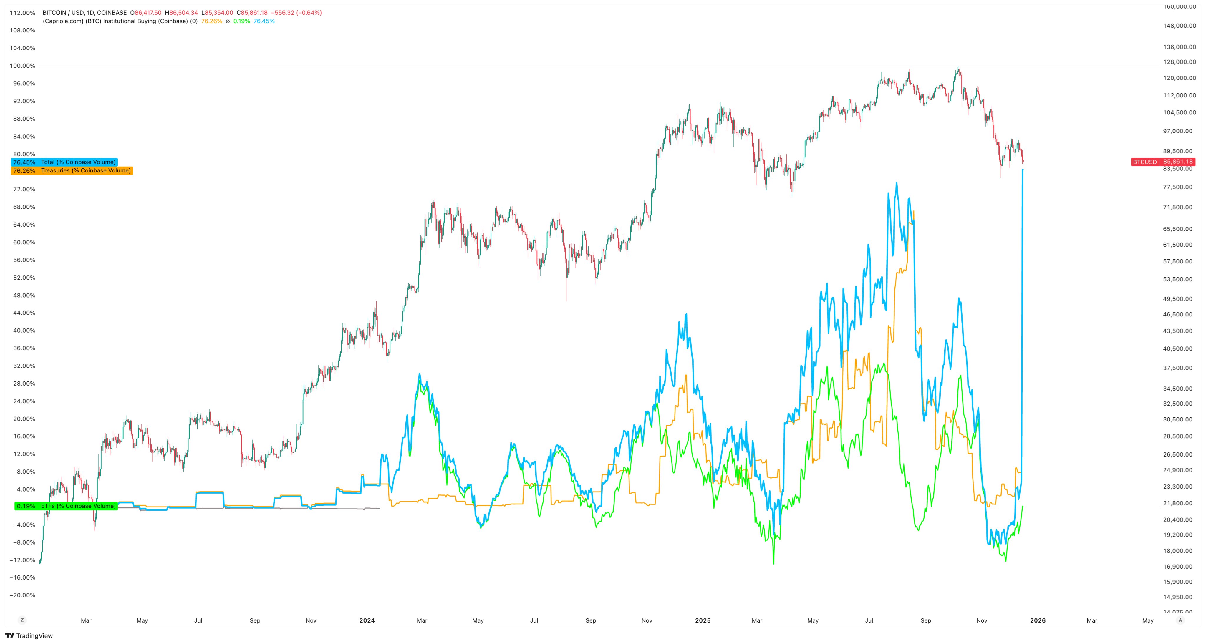 That imbalance aligned with Capriole Investments’ assessment that record institutional buying has been met by equally historic long-term holder distribution.
