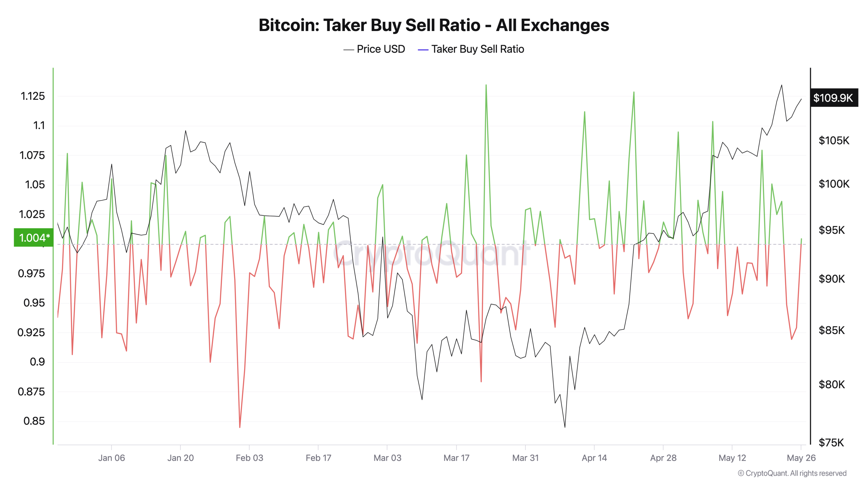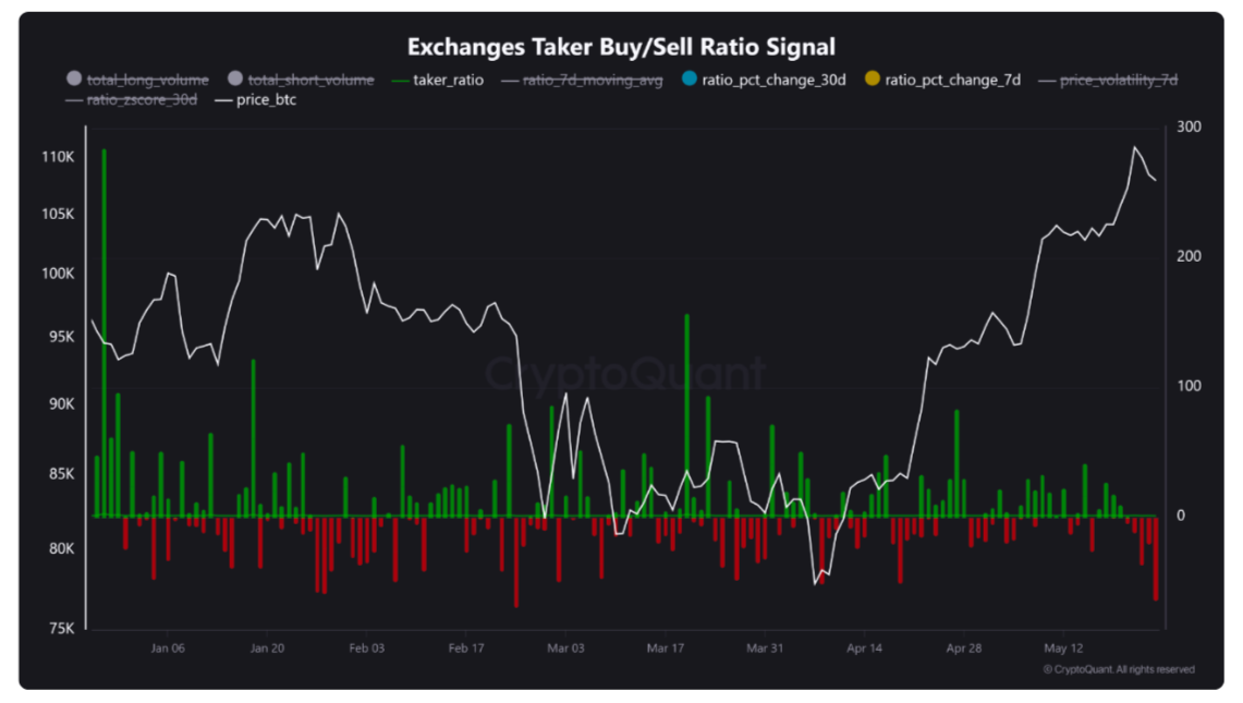 The taker buy/sell ratio tracks the ratio of buy to sell volume across takers during perpetual swap trades, and on May 25, it slid below the key level of 1 for the first time since early April.