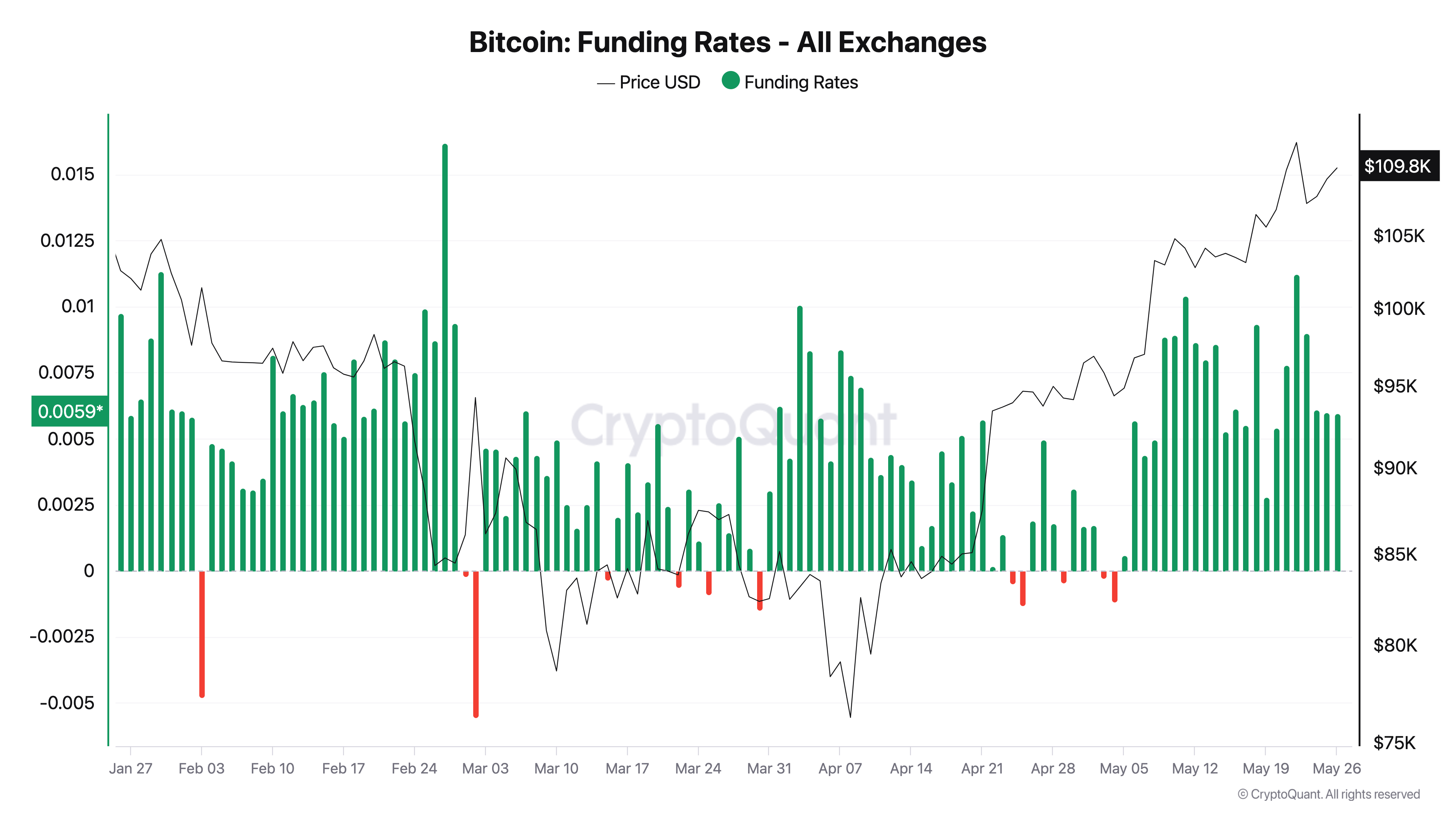 CryptoQuant data puts the cross-exchange Bitcoin funding rate at 0.006 as of May 25.