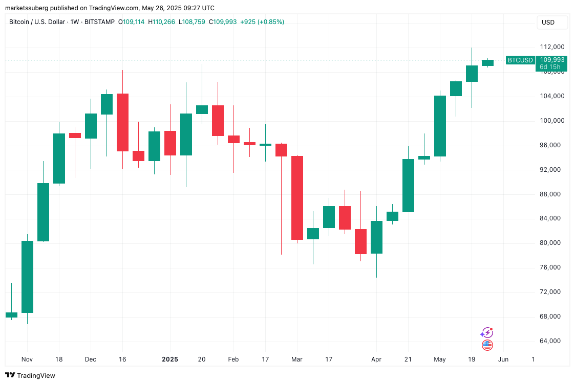 Bitcoin swapped late-weekend weakness for gains into the May 25 weekly candle close, a move which ultimately took BTC/USD above the $110,000 mark.