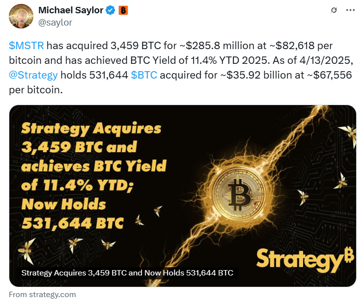 Công ty tài sản kỹ thuật số của Michael Saylor, Strategy, đã mua 3.459 Bitcoin với giá 285.5 triệu đô la, báo hiệu sự tin tưởng tiếp tục vào Bitcoin ngay cả khi thị trường toàn cầu phải đối mặt với những khó khăn liên quan đến thương mại.