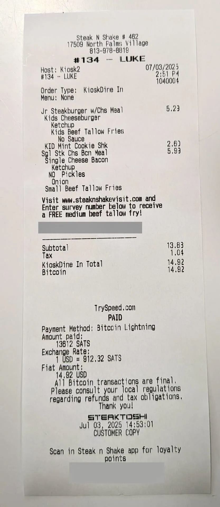 Receipt from a Florida Steak & Shake on July 3, 2025, using the Bitcoin Lightning payment method. Source: British Blockchain Association
