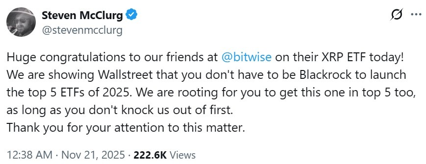 Canary CEO Steven McClurg congratulated Bitwise on the launch, saying that they’re “rooting” for them despite being competitors in the space.