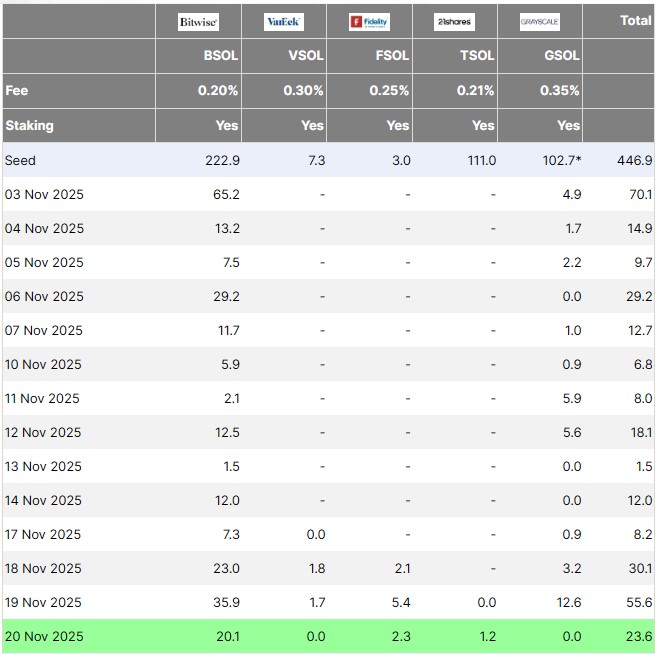 SOL-based ETF products attracted between $8.26 million and $55.61 million per day this week, with Nov. 19 marking the strongest daily inflow.