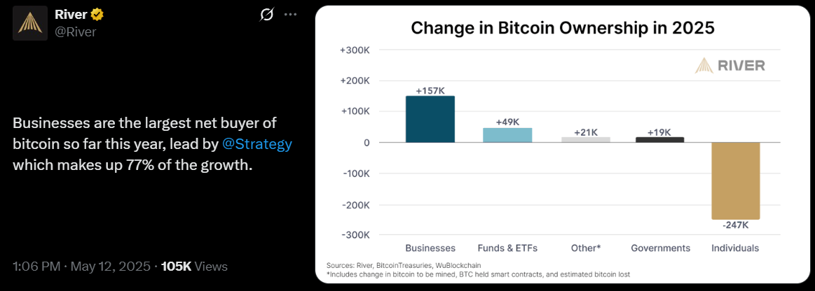 According to River’s estimates, individual investors sold a total of 247,000 BTC throughout 2025, equivalent to $23 billion based on the average price during the period. Meanwhile, Michael Saylor’s Strategy accounted for 77% of the 157,000 BTC acquired by businesses that year.