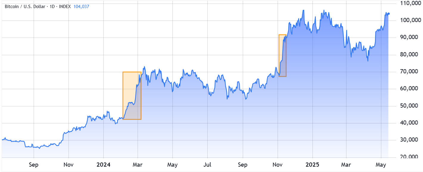 A comparable spike in retail demand occurred on March 9, 2024, when the Coinbase app rose to the fourth most downloaded in the US finance category, up from 35th place just two weeks earlier. At the same time, Google search interest for “Bitcoin” hit its highest level in 20 months, roughly six days after Bitcoin surpassed its prior record daily close of $68,000 from November 2021.