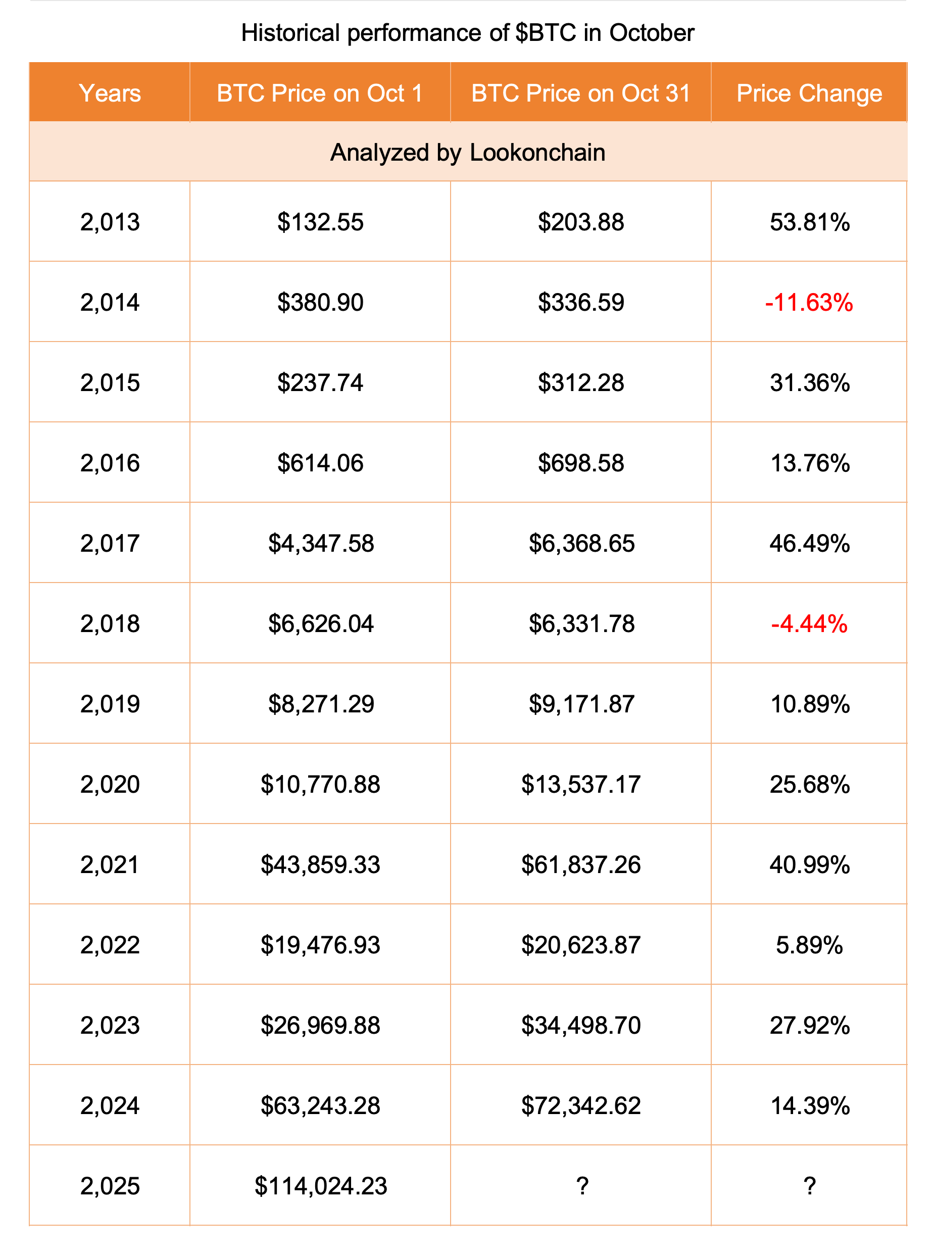 Bitcoin (BTC) closed September with a 5.35% gain, shaking off a late-month correction. Historically, such green Septembers have set the stage for a bullish “Pumptober,” according to onchain data resource Lookonchain.