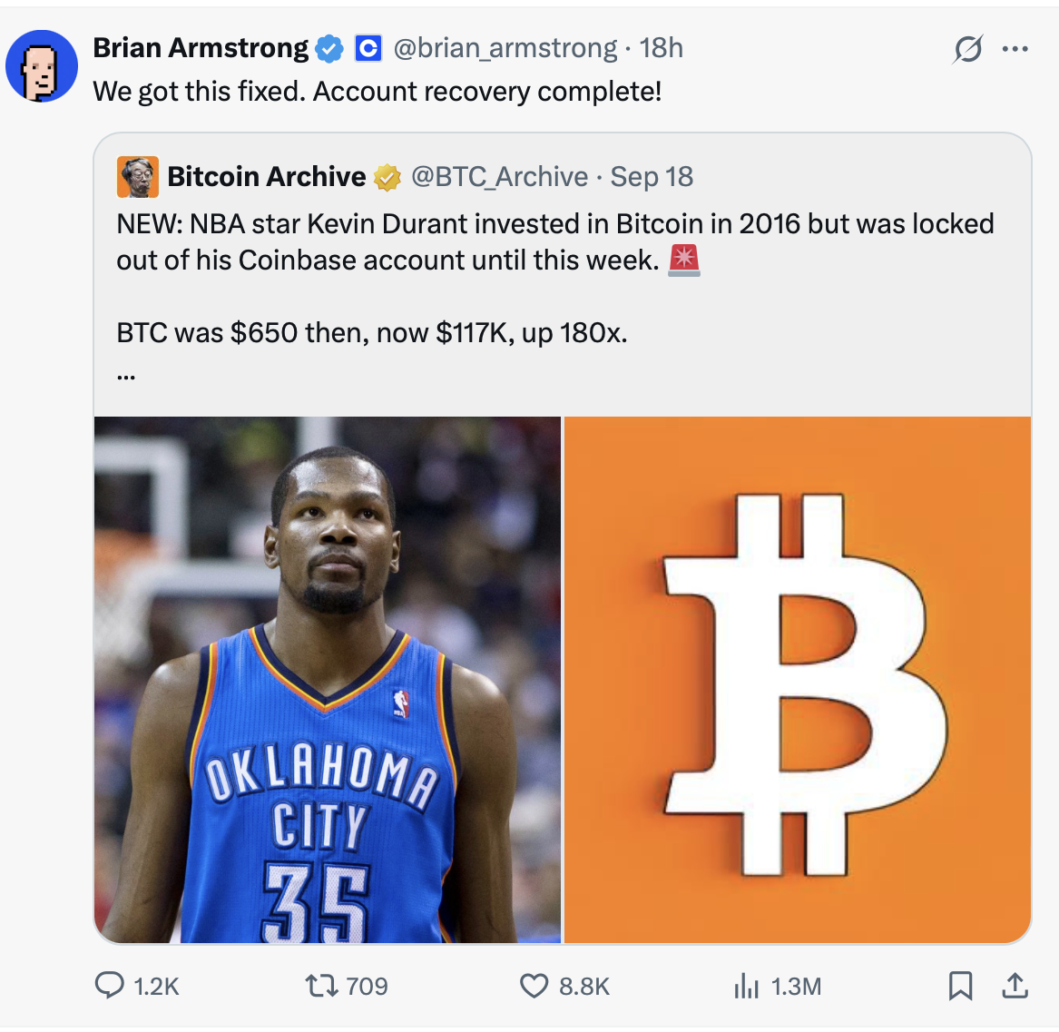 Nearly 10 years after buying Bitcoin on Coinbase, NBA superstar Kevin Durant has regained access to his holdings thanks to a completed account recovery.