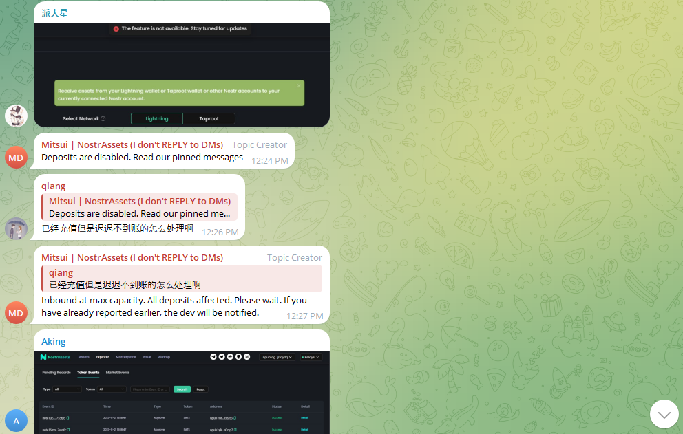 Theo thông báo ngày 5 tháng 12 được đăng trên Telegram, các nhà phát triển Nostr Assets cảnh báo, “Vui lòng chờ đợi các thông báo tiếp theo và không cố gắng gửi tiền vào NoStrAssets trong thời gian này.”