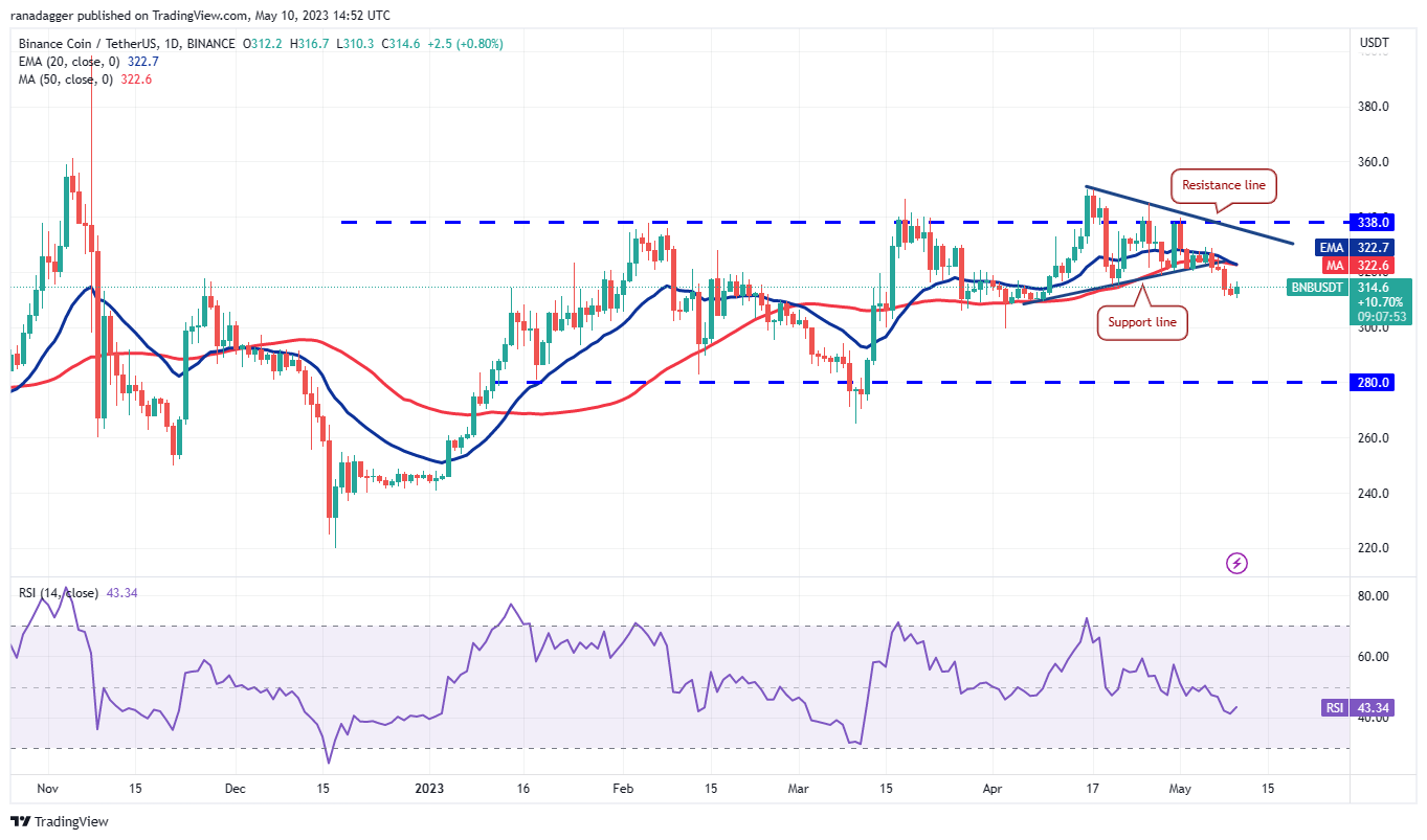 Việc bán tăng lên vào ngày 8 tháng 5 và cặp BNB/USDT bắt đầu hành trình hướng tới hỗ trợ tâm lý ở mức 300 đô la. Mức này có thể thu hút mua, điều này có thể bắt đầu phục hồi đến đường EMA 20 ngày ($322
