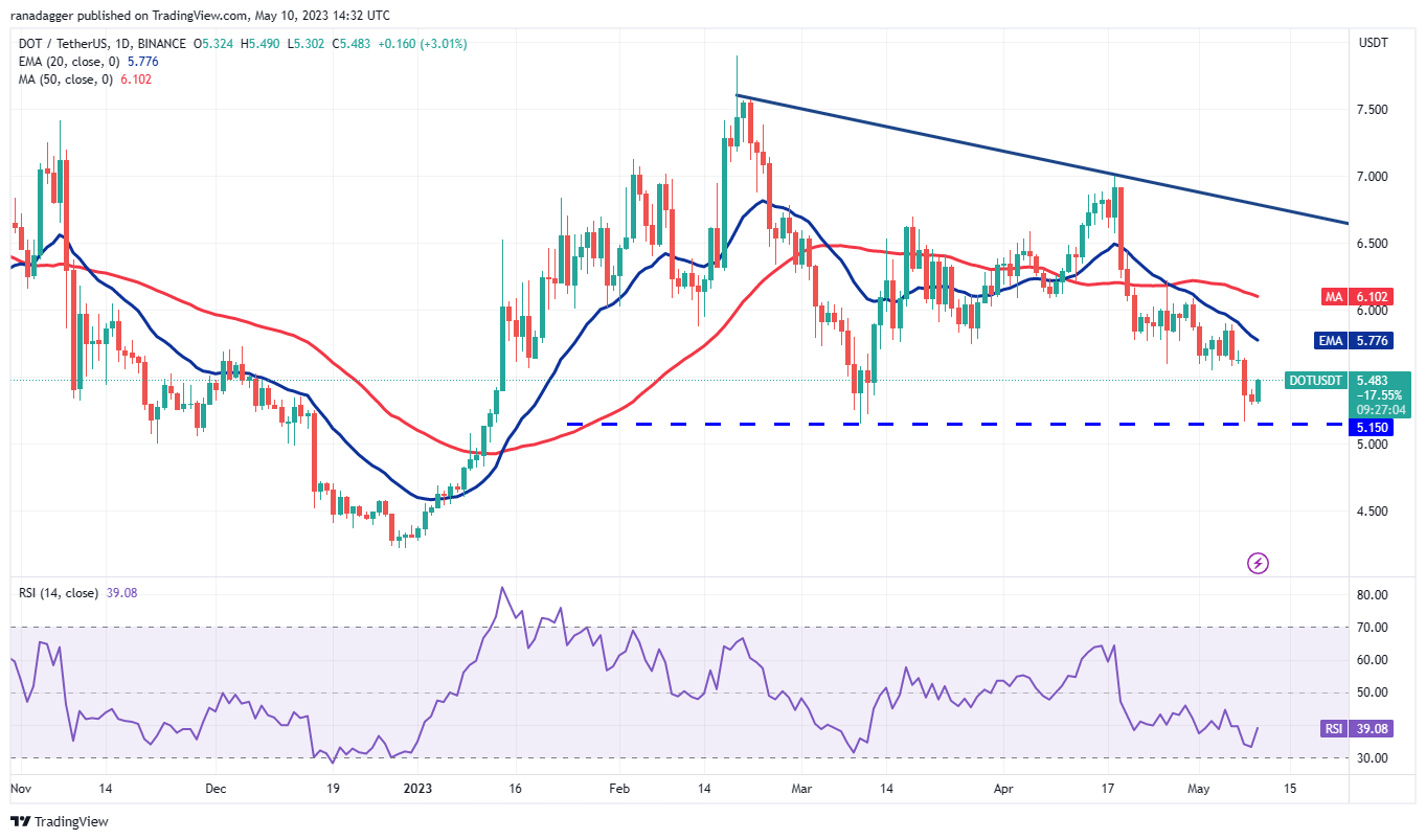 The bulls are trying to protect the strong support at $5.15 as seen from the long tail on Polkadot’s (DOT) May 8 candlestick.