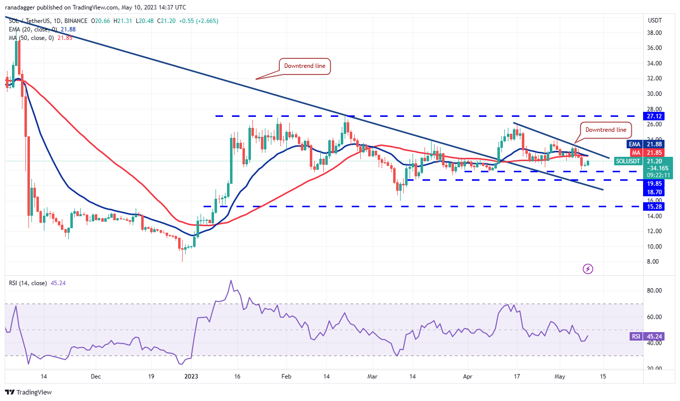 Solana (SOL) turned down from the downtrend line on May 6 and fell to the strong support at $19.85 on May 8.
