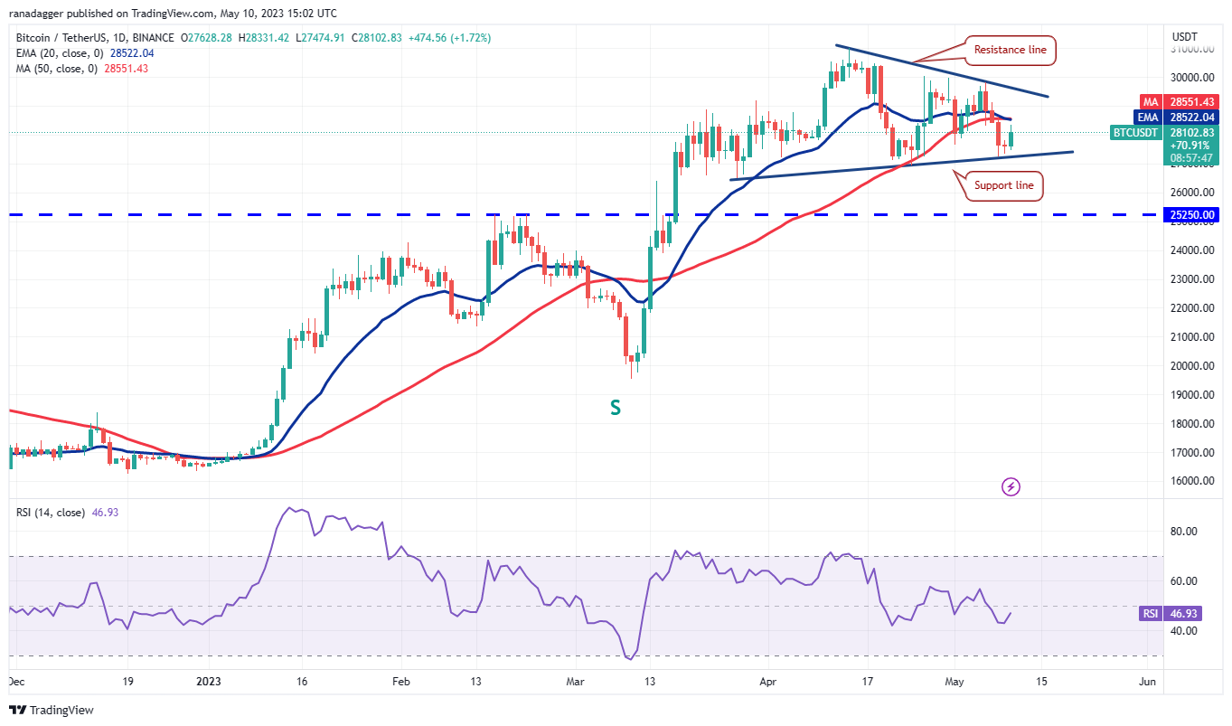 Bitcoin đã phá vỡ dưới đường trung bình vào ngày 7 tháng 5 và chuyển sang đường hỗ trợ của mô hình tam giác đối xứng vào ngày 8 tháng 5. Những con bò đang cố gắng bảo vệ mức này với sức mạnh nhưng sự phục hồi có thể gặp khó khăn ở mức cao hơn