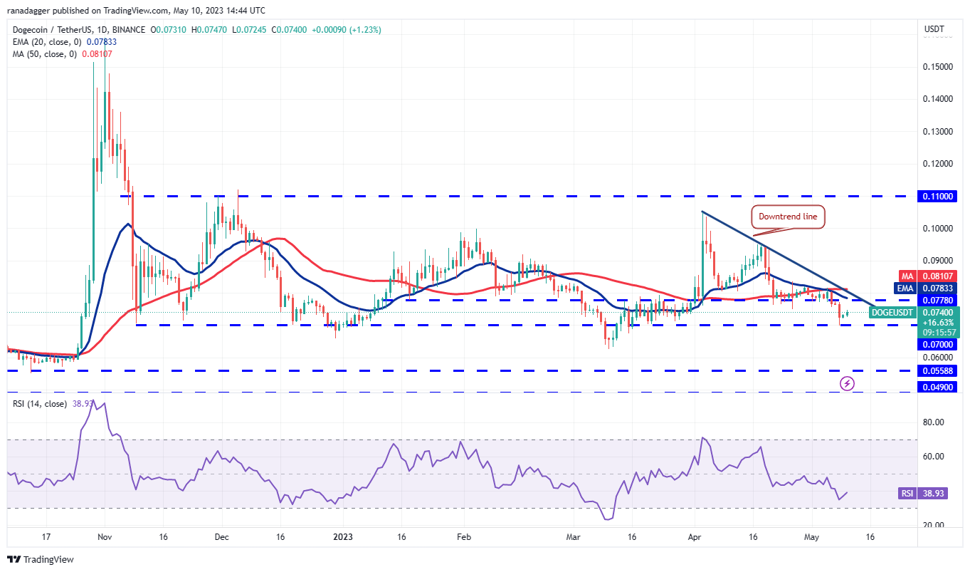 Dogecoin (DOGE) continued its downward journey and touched the solid support at $0.07 on May 8. The bulls are trying to achieve a bounce off this level.
