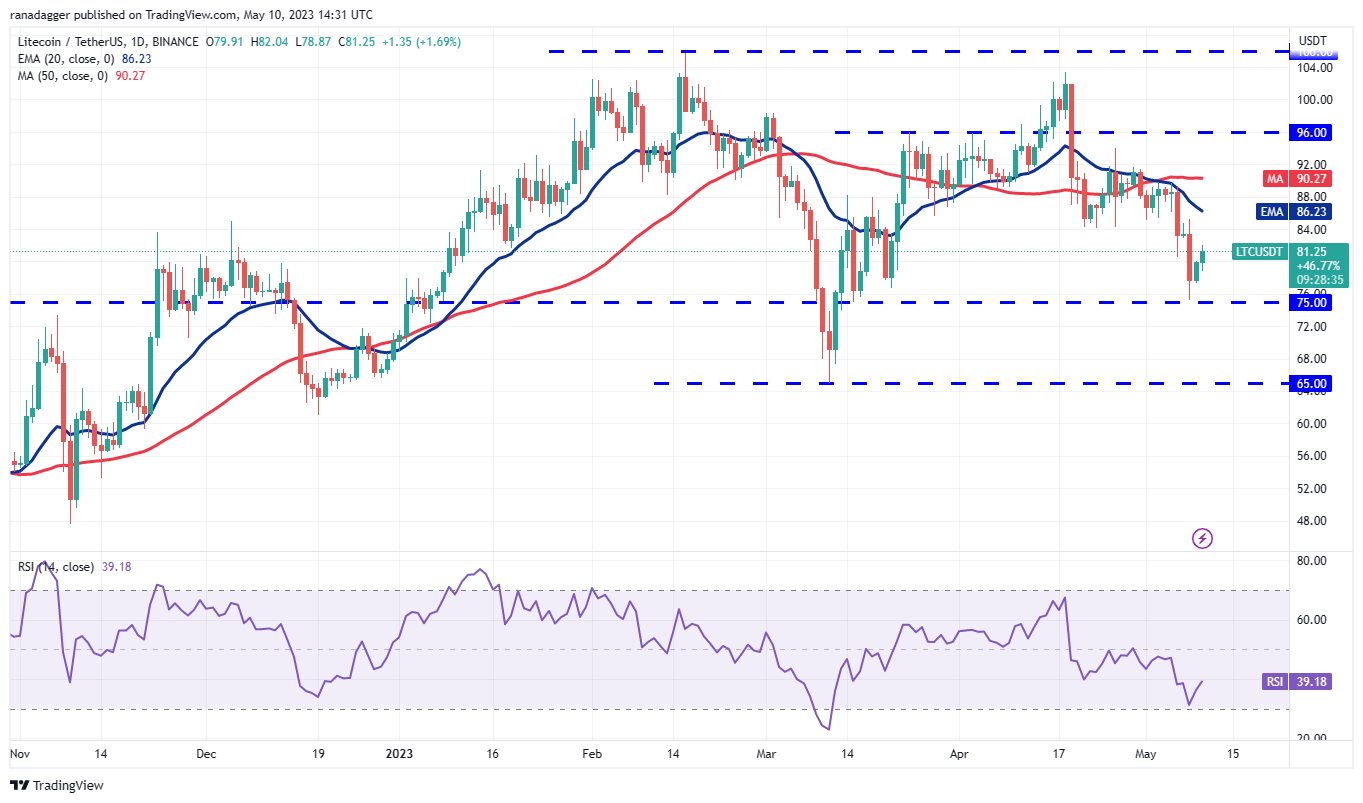 Litecoin (LTC) rebounded off the crucial support at $75 on May 8, indicating that the bulls are trying to arrest the decline at this level.