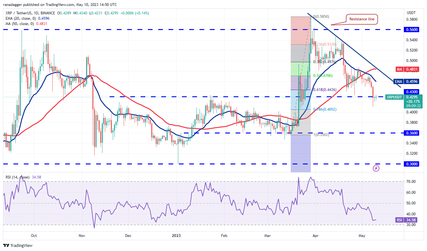 XRP (XRP) crashed below the $0.43 support on May 8 but the long tail on the candlestick shows strong buying at lower levels.