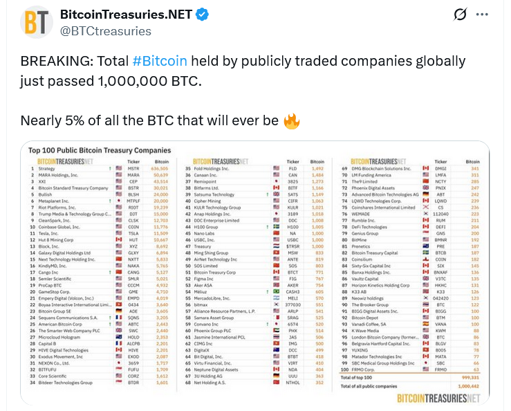 BitcoinTreasuries.NET confirmed the feat on Thursday, with a few additional purchases pushing the tally to 1,000,698 Bitcoin, worth over $111 billion.