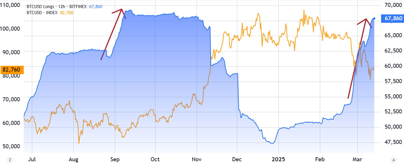 Số tiền ký quỹ dài hạn trên Bitfinex đã tăng lên mức cao nhất kể từ tháng 11 năm 2024, thêm 13,787 BTC trong 17 ngày. Hiện đang ở mức 5.7 tỷ đô la, định vị đòn bẩy tăng giá này báo hiệu sự tin tưởng vào tiềm năng tăng giá của Bitcoin bất chấp sự suy giảm giá gần đây