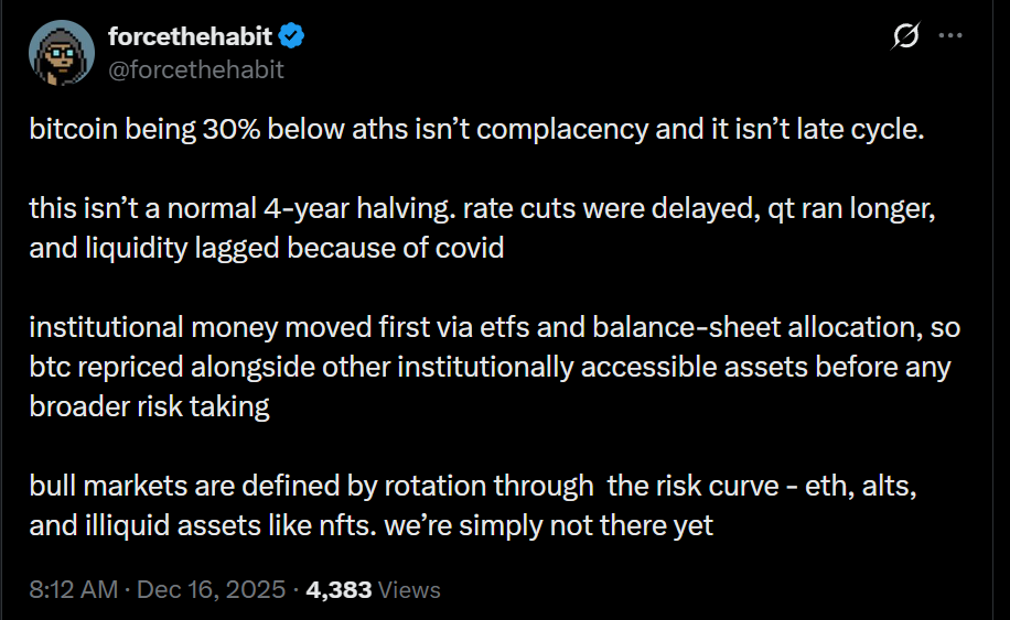 According to X user ‘forcethehabit’, Bitcoin’s decline does not represent a trend change, as interest rate cuts have been delayed and the US Federal Reserve (Fed) has reduced its balance sheet for longer than expected. The analysis also notes that institutional capital entered primarily through ETFs and corporate reserves, while rotation into riskier and more illiquid assets has yet to materialize.
