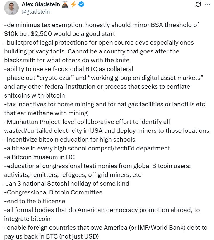 Chief strategy officer of the Human Rights Foundation, Alex Gladstein, also had a range of suggestions, including that the PAC should push for legal protections on open-source developers, incentivize Bitcoin education for high schools and allow foreign countries that owe America to pay back debts in Bitcoin.